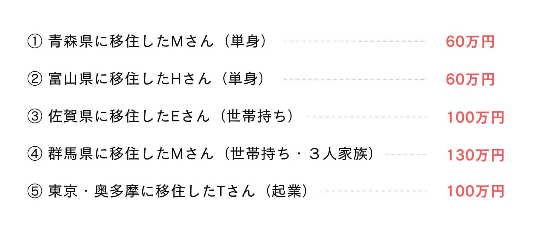 ちなみに、実際に「移住支援金」の申請を行った5名の体験者の支給額は以下の通り。