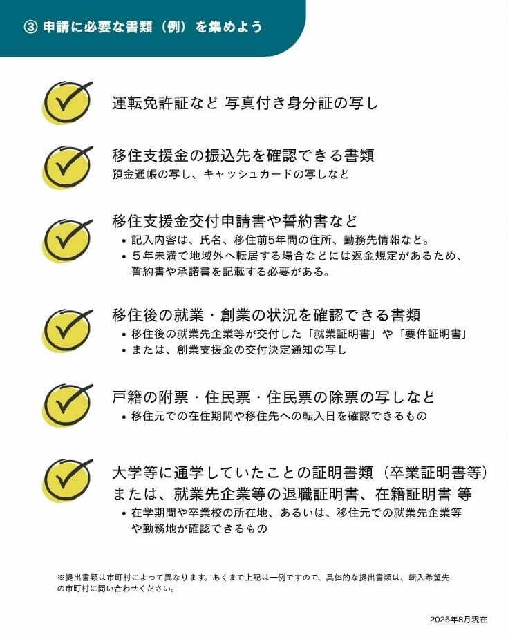 参考:「移住支援金の交付申請に必要な書類の例」(長野県諏訪郡富士見町)
