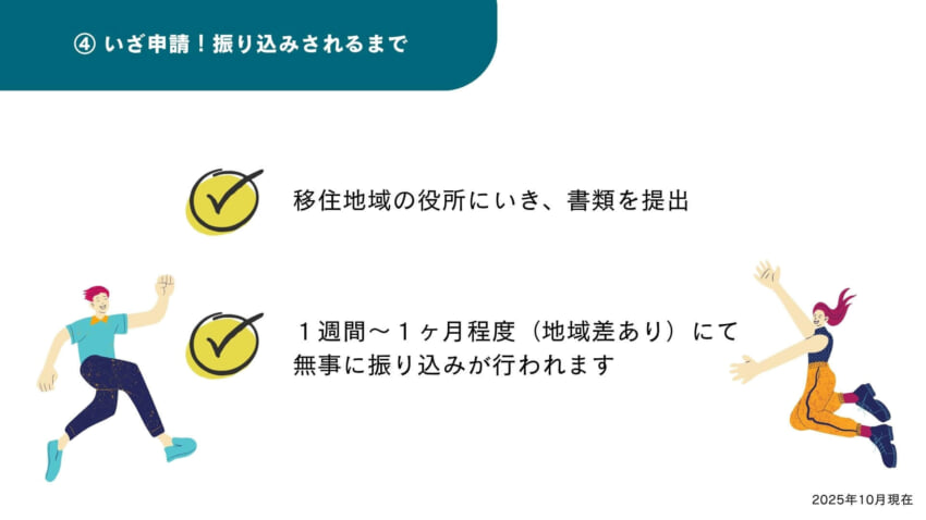 書類がまとまったら移住先の役所等へ提出。支援金の振り込みは地域差がありますが、順調にいけば1、2週間〜1カ月程度で完了するそうです。
