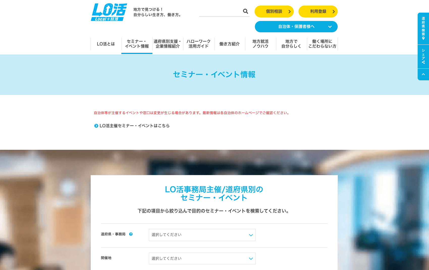 各地のフェア情報は、LO活サイトのセミナー・イベント情報で都道府県別に検索できます。(https://local-syukatsu.mhlw.go.jp/seminar/)